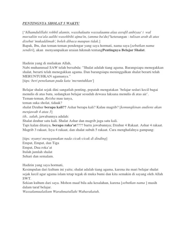 Contoh teks pidato singkat yang akan mimin bahas seperti pidato tentang pendidikan bahasa indonesia, agama islam tentang al quran, . Syukur dalam agama islam mempunyai peranan yang penting dalam mengatur tindakan yang berangkat dari hati. Contoh teks pidato singkat yang akan mimin bahas seperti pidato tentang pendidikan bahasa indonesia agama islam tentang al quran pidato pembangkit semangat . Teks ceramah singkat agama berbagai topik, yang bisa kita pakai untuk khutbah, kultum dan pidato, diantaranya tentang, sabar, ibu, ikhlas, kematian dll. Shalat adalah tiang agama, karena itu mari belajar shalat sejak kecil agar agama islam tetap tegak di muka bumi dan kita .